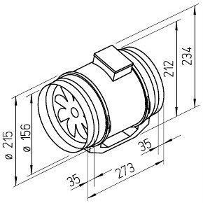 Корпус из ударопрочного и устойчивого к коррозии пластика, цвет - светло-серый, имеет штампованный монтажный кронштейн для упрощенной установки на стены и потолки, а также приточные и напорные соединительные патрубки, рассчитанные на подключение труб стандартного диаметра. После отвинчивания стяжного хомута вентиляторный блок и клеммная коробка поворачиваются в любое положение и извлекаются для обслуживания и чистки. В комплект поставки включены дюбели и винты.