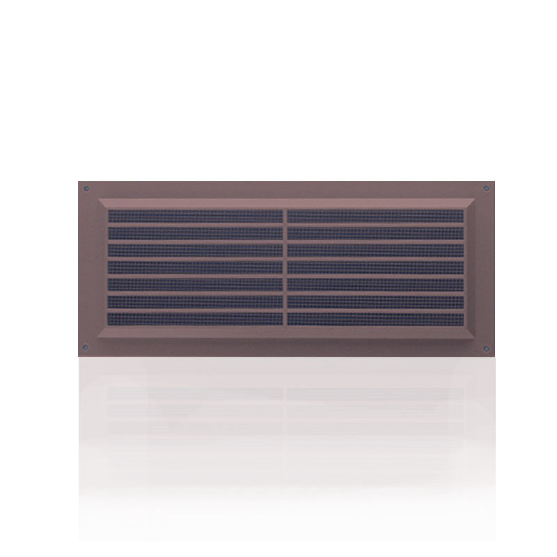 Решетка применяется для декорирования выходов систем вентиляции, оборудована защитной сеткой и наклонными жалюзи.